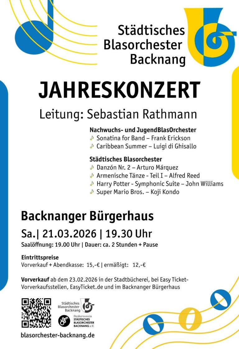 Dieses Konzert ist für uns in jeder Hinsicht ein besonderes Ereignis. Seit Anfang Dezember steht das Städtische Blasorchester Backnang unter neuer Leitung: Sebastian Rathmann, vielen bereits als unser Jugenddirigent bekannt, hat das Orchester kommissarisch übernommen. Mit viel Herzblut und Engagement führt er uns durch diese Übergangsphase, bis eine dauerhafte Nachfolge gefunden ist.